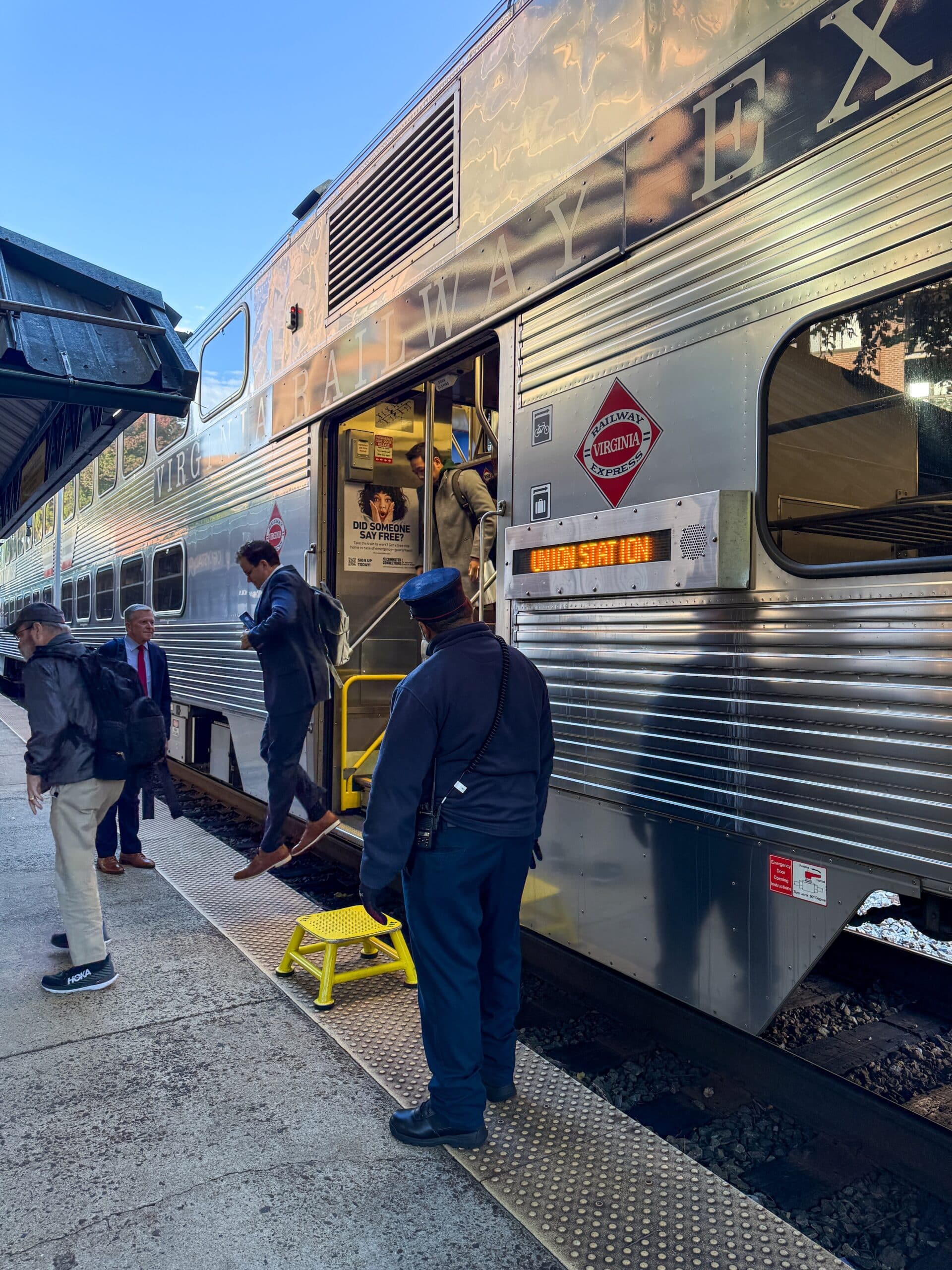 Make sure your VRE ticket covers the same zones as your Amtrak trip. For example, if you’re going from Fredericksburg (Zone 9) to Union Station (Zone 1), your VRE pass must be valid for those zones.